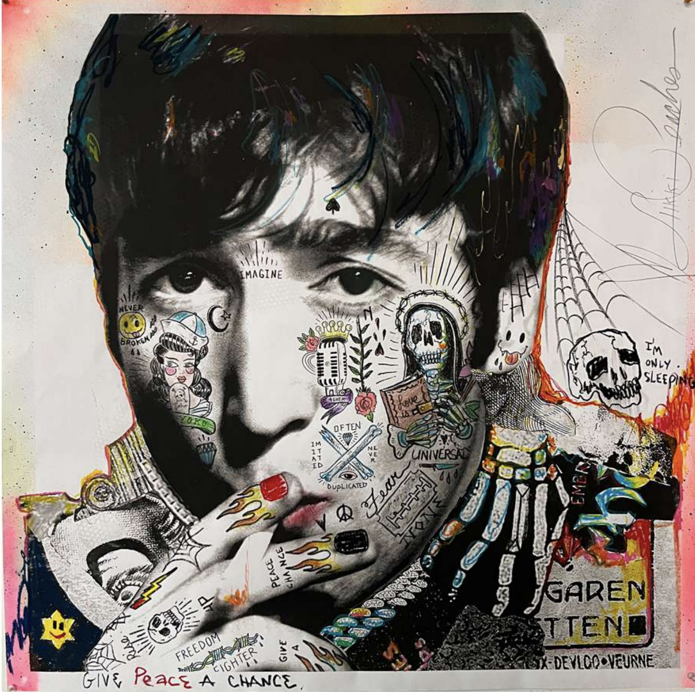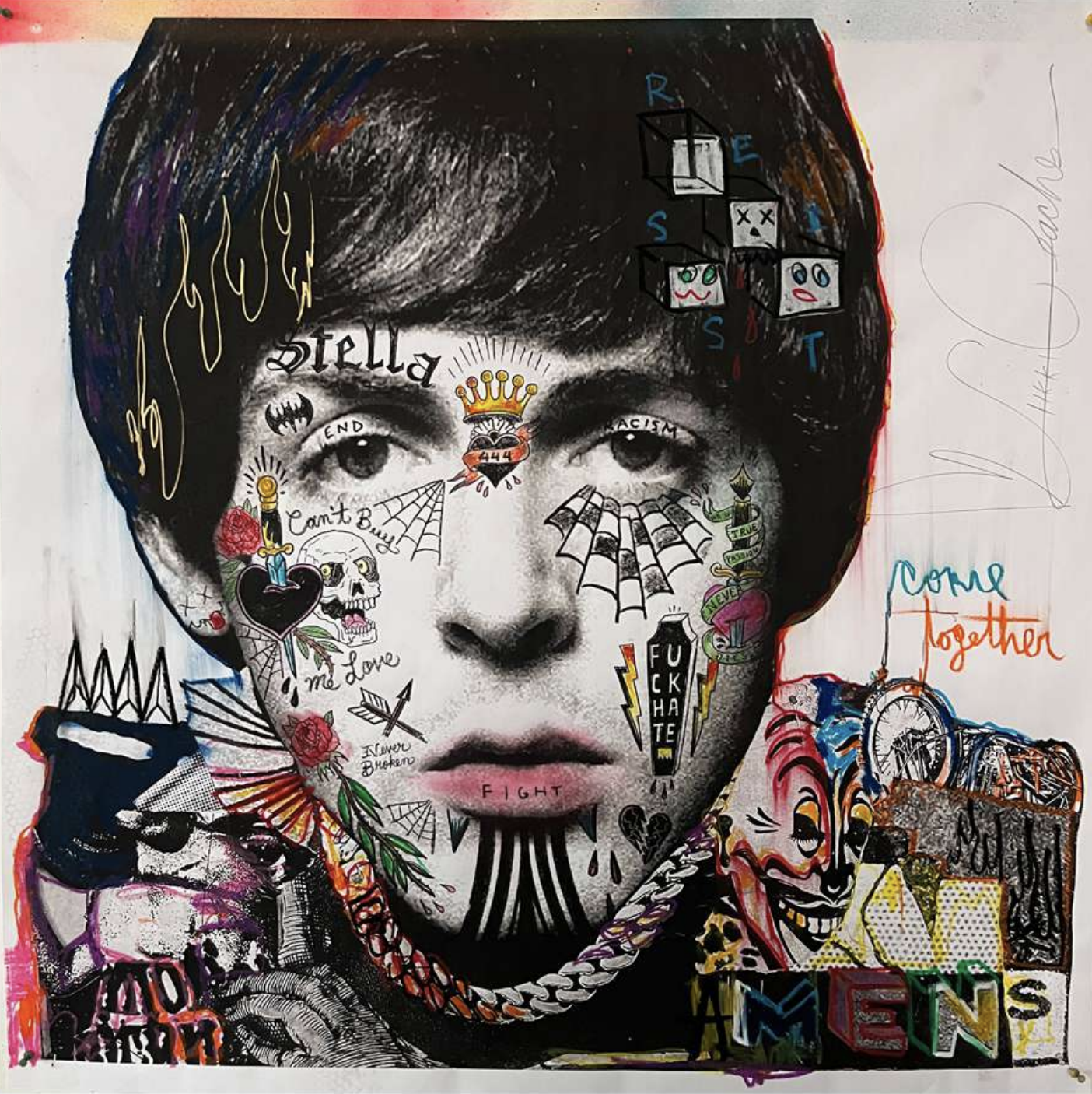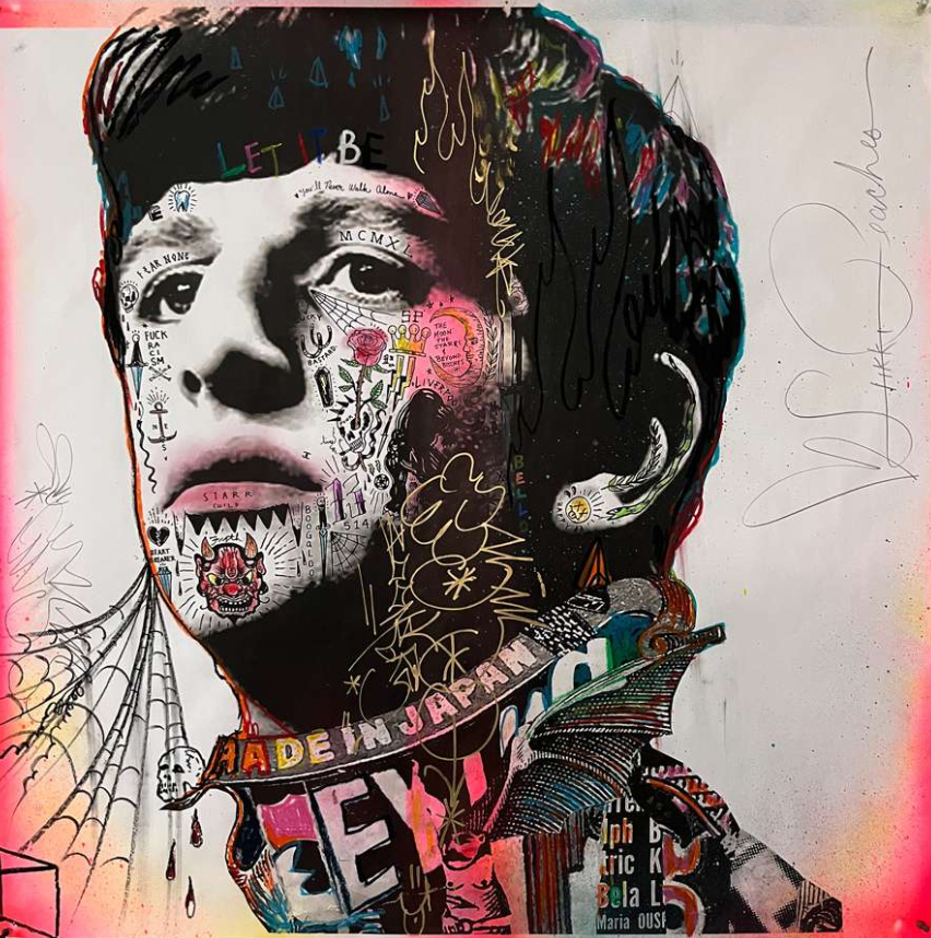 Stikki Peaches, a pseudonymous street artist from Montreal, Quebec, blends pop culture, street art, and social commentary in his work. Known for his large-scale portraits of music legends and playful character mash-ups, his art evokes nostalgia and invites reflection on the intersection of media and society. His distinctive style, marked by layering, mixed media, and punk influences, embodies “beautifully controlled chaos.” Since 2009, his work has appeared on public spaces, gaining global recognition while maintaining his anonymity. Stikki Peaches bridges street art and traditional art, emphasizing accessibility and posing the question: “What if Art Ruled the World?”