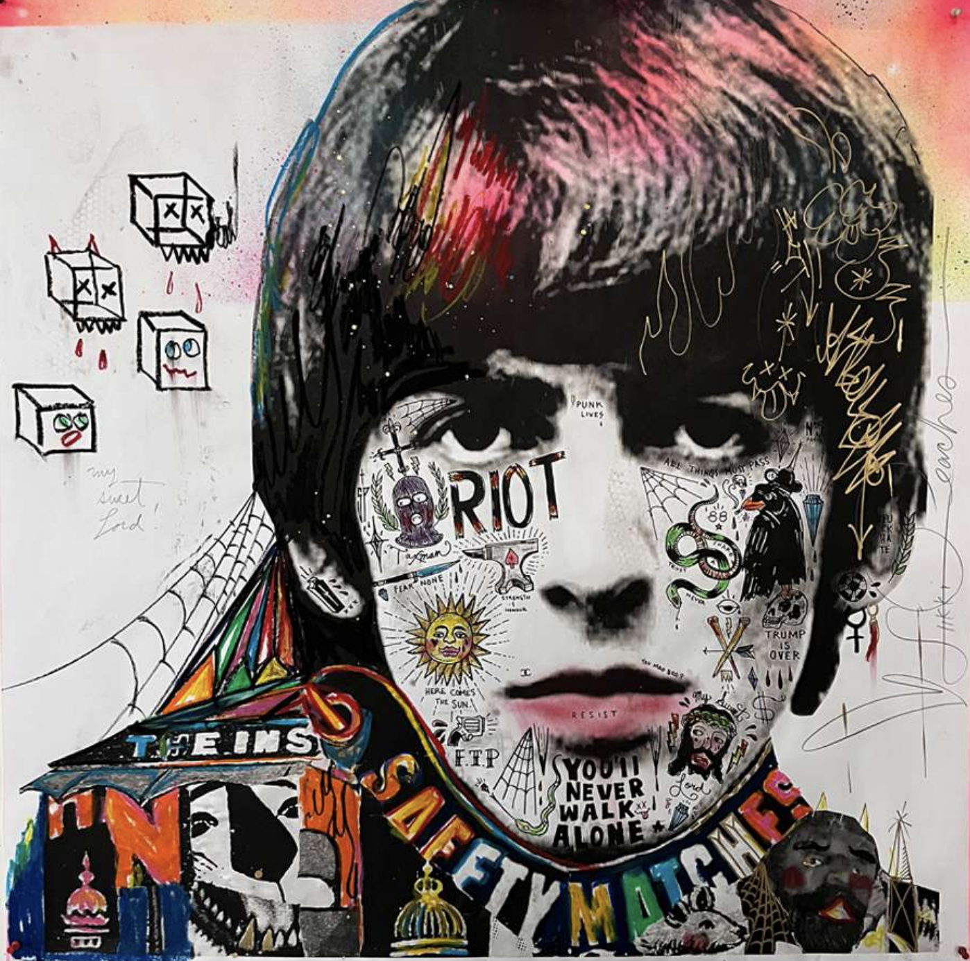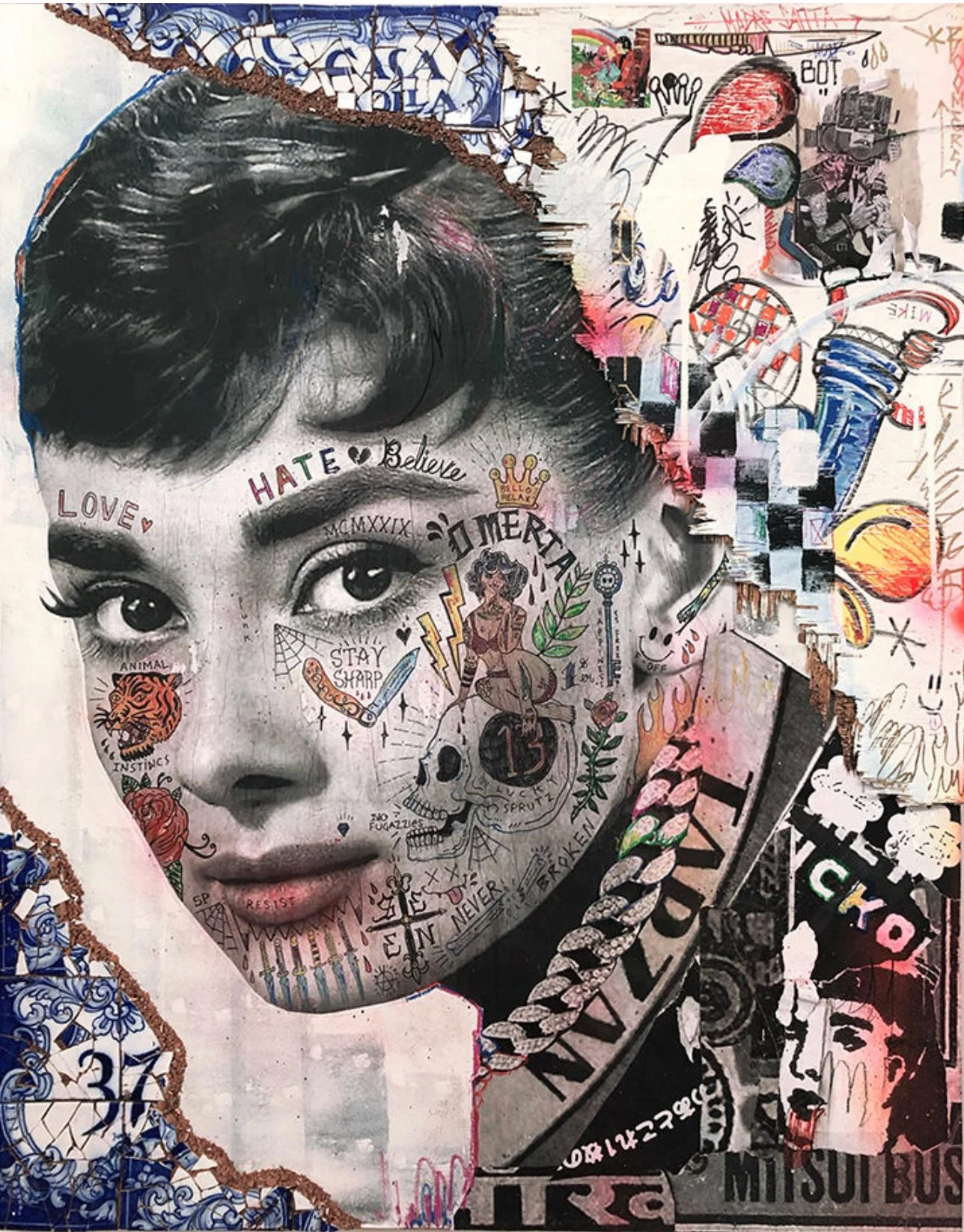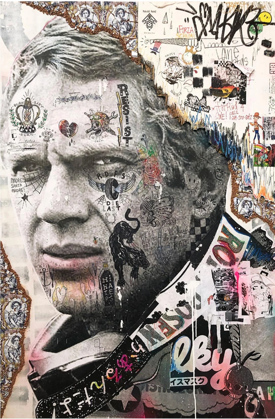 Stikki Peaches, a pseudonymous street artist from Montreal, Quebec, blends pop culture, street art, and social commentary in his work. Known for his large-scale portraits of music legends and playful character mash-ups, his art evokes nostalgia and invites reflection on the intersection of media and society. His distinctive style, marked by layering, mixed media, and punk influences, embodies “beautifully controlled chaos.” Since 2009, his work has appeared on public spaces, gaining global recognition while maintaining his anonymity. Stikki Peaches bridges street art and traditional art, emphasizing accessibility and posing the question: “What if Art Ruled the World?”
